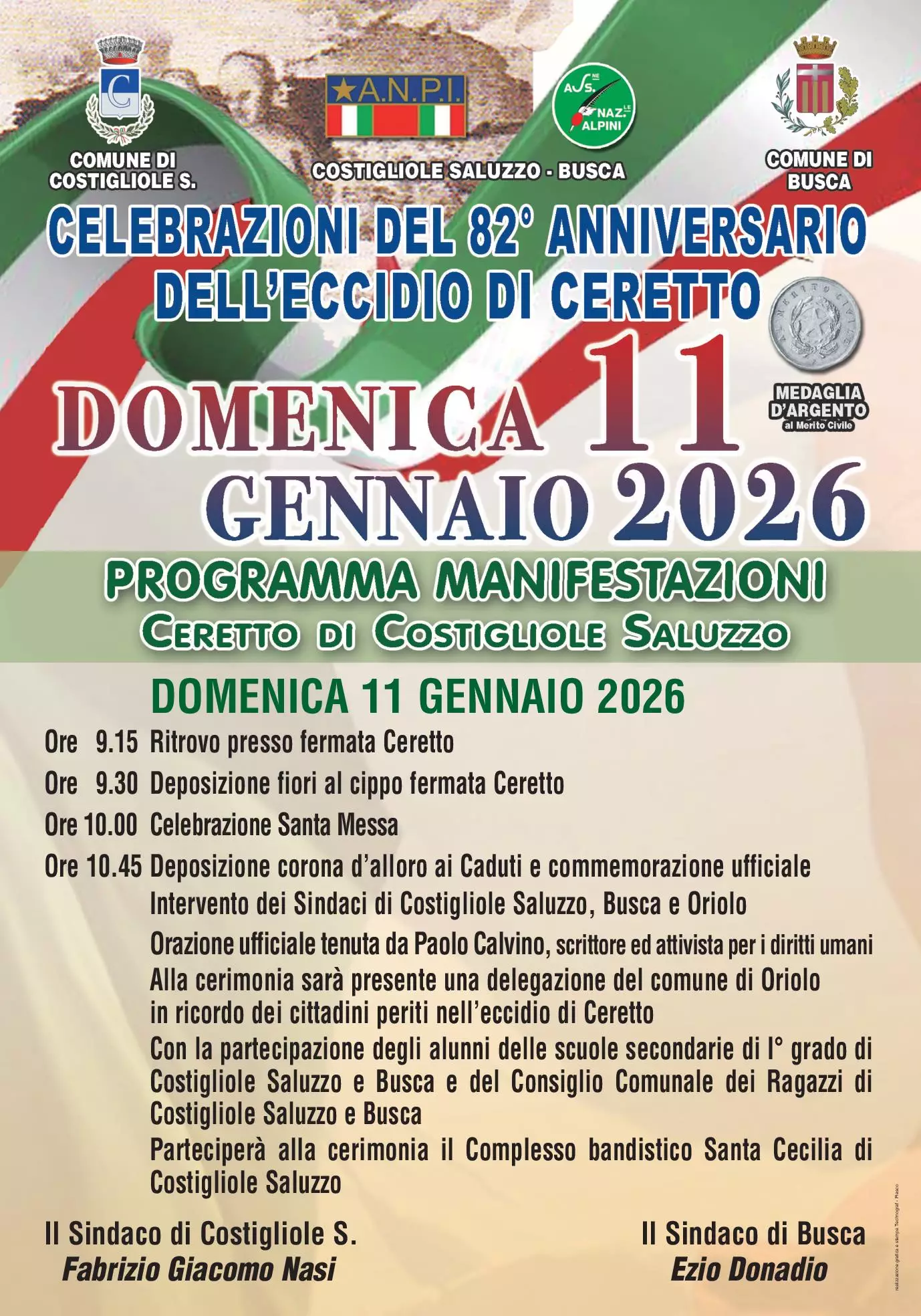 Alla cerimonia interverranno i ragazzi degli istituti secondari di I° grado di Costigliole Saluzzo e Busca ed il Consiglio Comunale dei Ragazzi e delle Ragazze di Costigliole Saluzzo e Busca, parteciperà alla manifestazione il Complesso Bandistico Santa Cecilia.